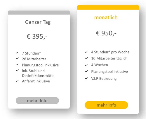 - Transport des der benötigten Verbrauchsmaterialien, wie Desinfetionsspary, Öl, Handtücher, etc.